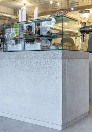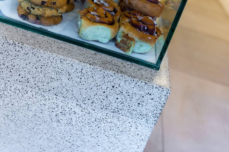 The polished concrete countertops are a standout feature, complementing the pared-back industrial decor. Polished concrete offers a sleek and modern aesthetic, while its durability and low maintenance make it well-suited for a bustling cafe environment.