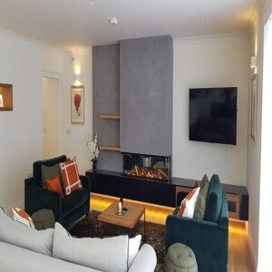 A sleek concrete fireplace creates contemporary structural interest in any room, and can be extended to a TV shelf giving great contrast and feature to any living space.